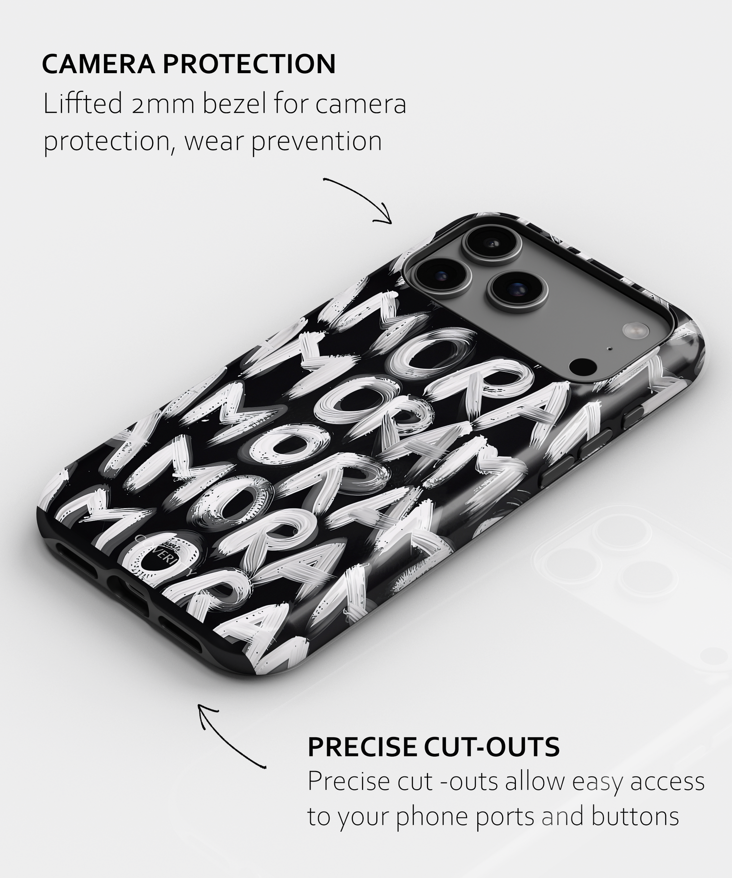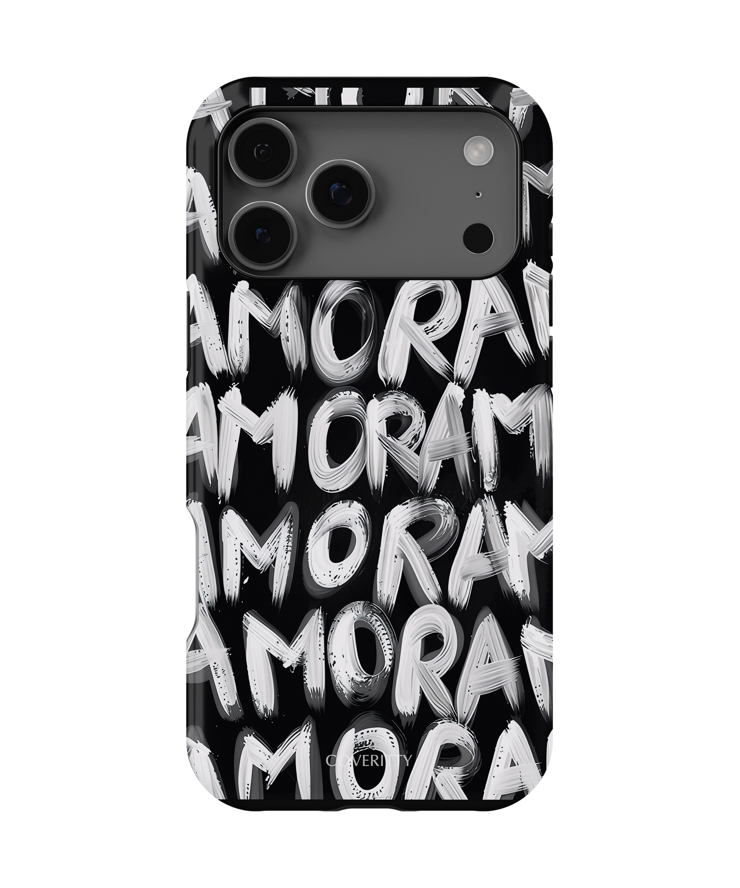 Modern artistic phone case with expressive AMOR typography in monochrome style