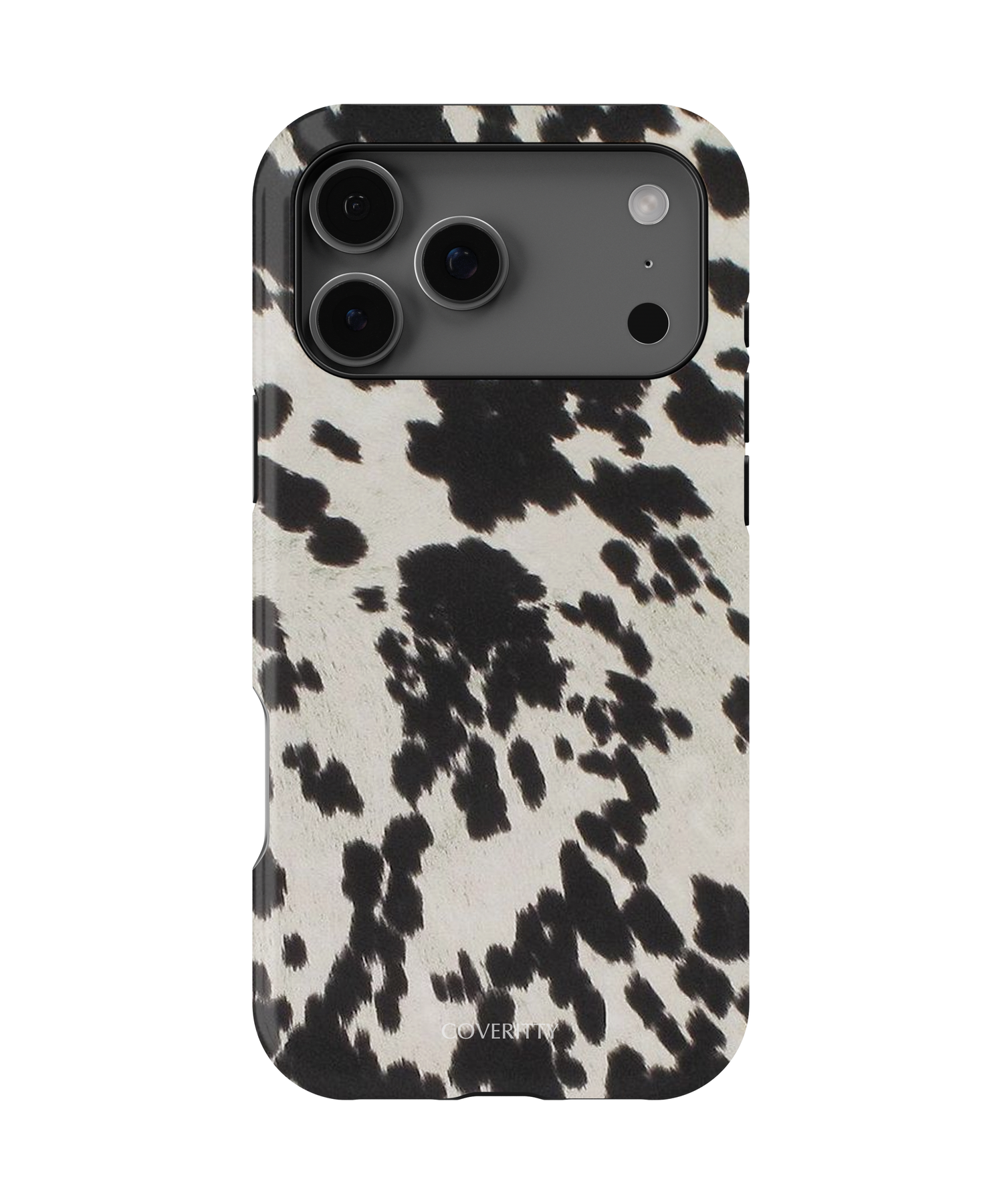 Phone case with black and white cow print pattern on a white background